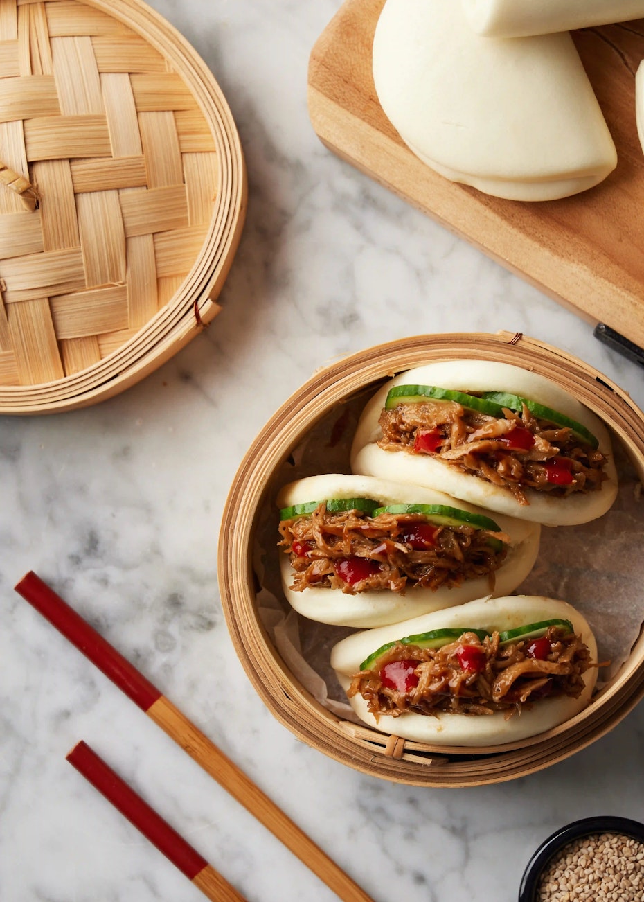- 3Escalfa els baos al vapor. Quan estiguin cuits, obre’ls i farceix-los amb el cogombre confitat amb vinagre i els Bocados Mediterráneos esqueixats.