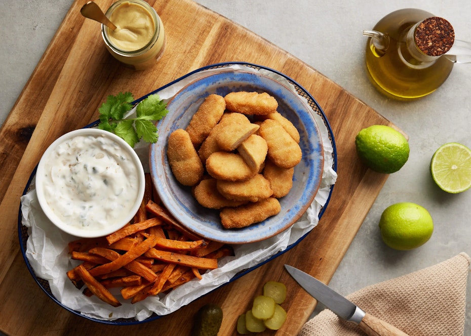 - 4Serveix la veganesa en un bol i acompanya els nuggets i el moniato amb la salsa.