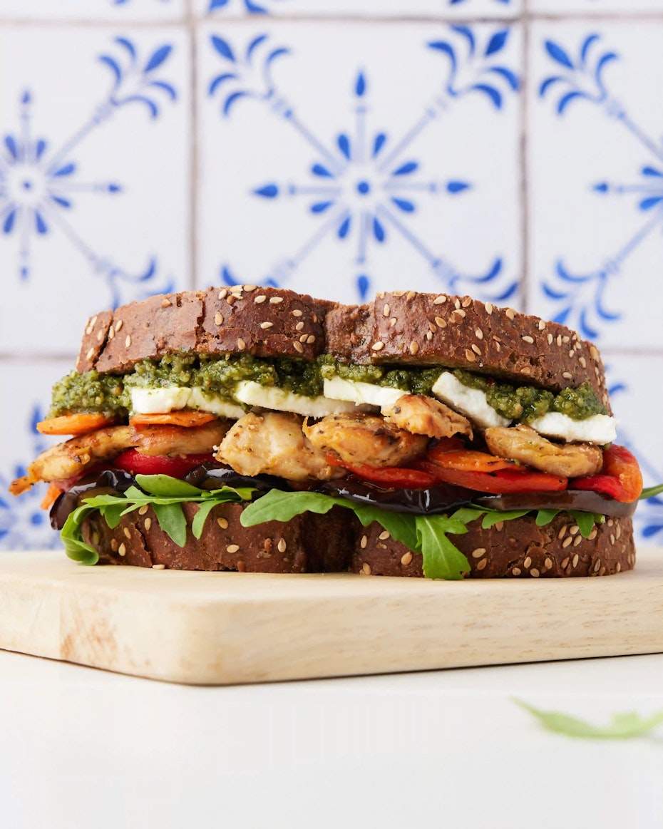 - 4Terminar con los bocados mediterráneos de Heura, el queso vegano cortado y cerrar el sándwich con la tapa untada con pesto.